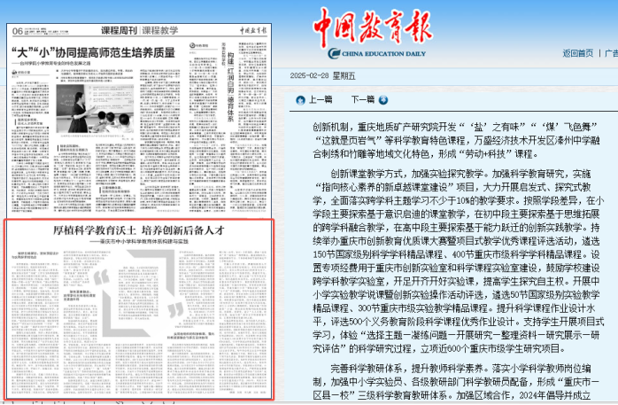近日,中国教育报在课程周刊版面刊发了题为《厚植科学教育沃土 培养创新后备人才——重庆市中小学科学教育体系构建与实践》的主题文章,文中对我院自研的多个科学教育特色课程作为典型进行了介绍。